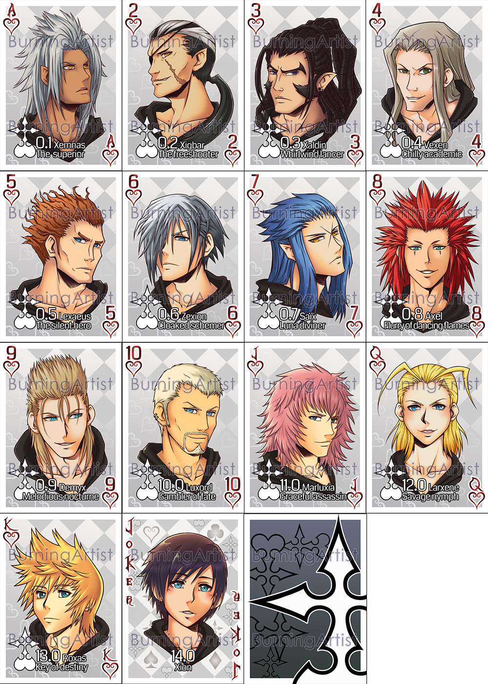 This is a pack of playing cards with my original art of the Organization 13 members from Kingdom Hearts! ~<3 (Comes with a custom box.)