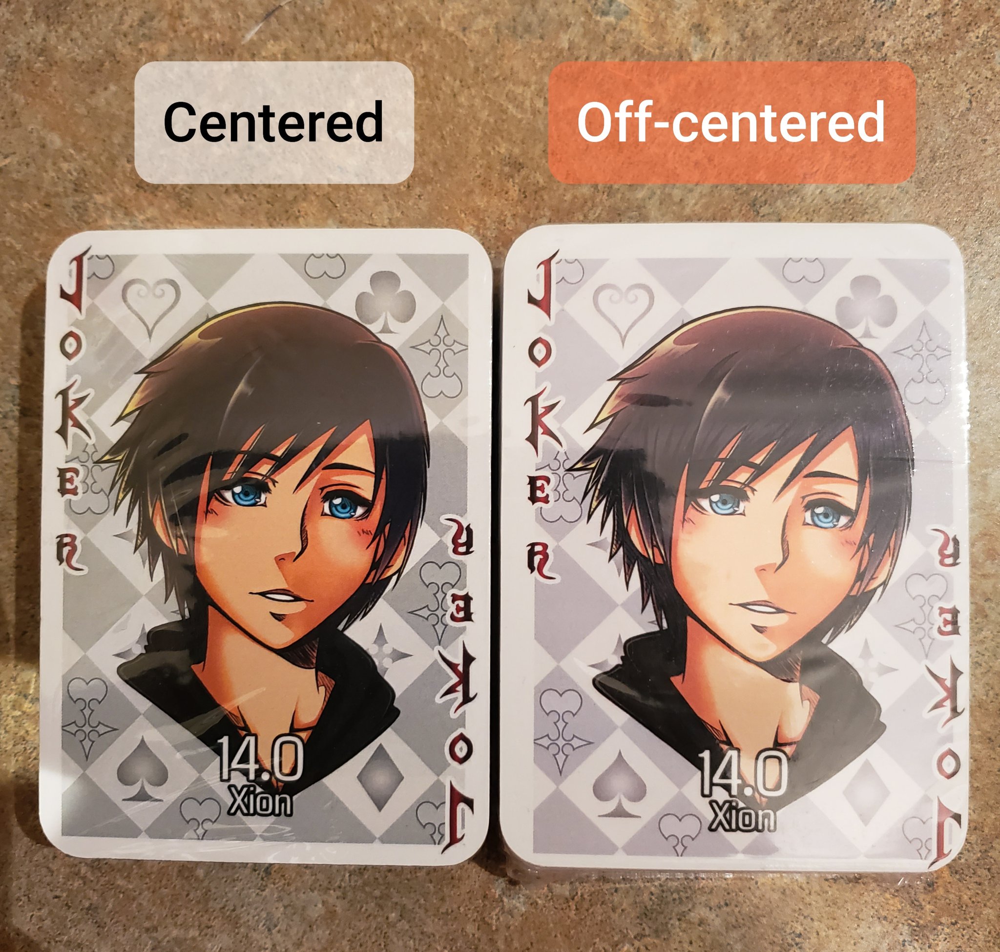 I had a misprint of cards that were off-center (see picture) & some are printed in a darker color. I am liquidating them at near 50% off. They DO come with boxes and are still playing card quality but have the defects listed above. There until supplies run out.