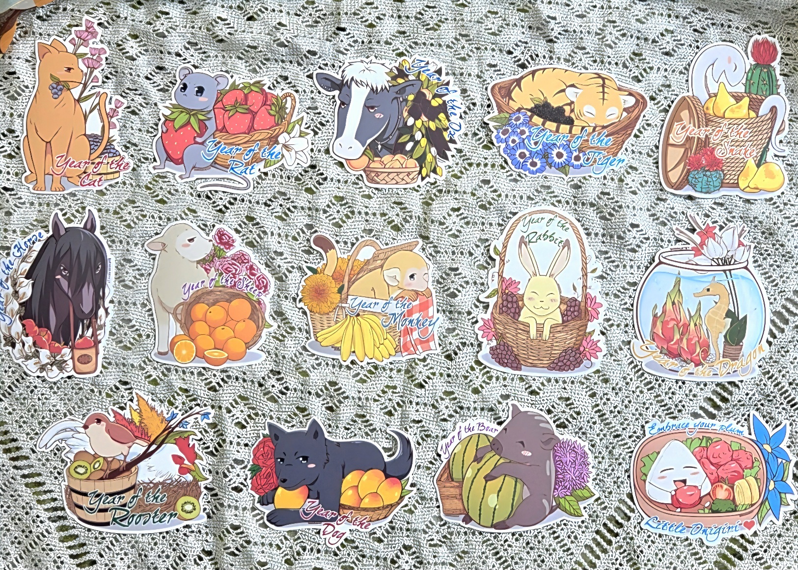 Here are your favorite Fruits Basket Zodiac characters (and Tohru) now available as stickers! The theme is... you guessed it: Fruits and Baskets (and flowers.)