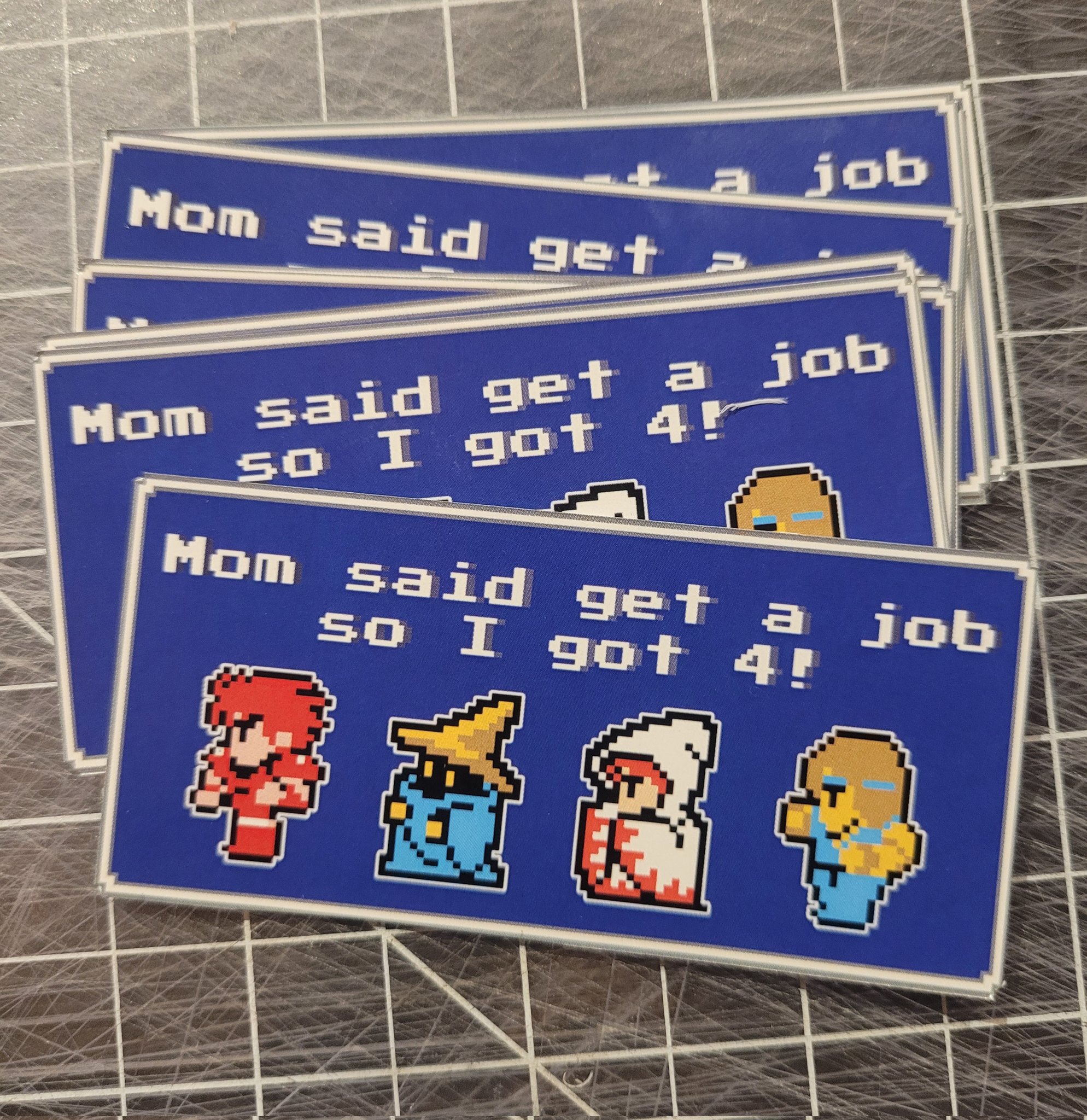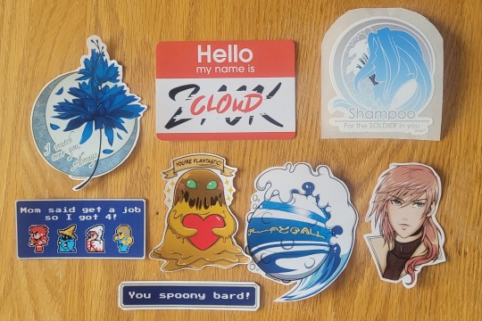 Various stickers from the Final Fantasy series in vinyl. (Except the Spoony bard)